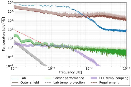 This requirement can be demanding assuming ambient temperature fluctuations of a typical laboratory environment, as shown in the results (Section 3). However, it is worth noting that this limiting factor imposes restrictions mainly during on-ground testing; conditions in space are typically milder in this sense. For instance, for LISA Pathfinder, the environmental thermal fluctuations at the electronics locations are below 2 at 1 mHz [18], well below this requirement.