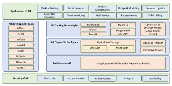 Syed, T.A.; Siddiqui, M.S.; Abdullah, H.B.; Jan, S.; Namoun, A.; Alzahrani, A.; Nadeem, A.; Alkhodre, A.B. In-Depth Review of Augmented Reality: Tracking Technologies, Development Tools, AR Displays, Collaborative AR, and Security Concerns. Sensors 2023, 23, 146. https://doi.org/10.3390/s23010146