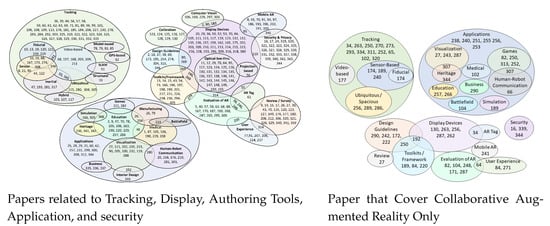 | 6 | Head mounted | Yes | i. Avionic Displays ii. Solos iii. Beyeonics | Shows AR experiences in front of the users’ eyes using HMDs | +VR world is compact in the smallest physical space +enables higher user focus on interaction with AR | -Must be worn, which could be disturbing -Lenses may impact the user experience | Education Medicine Healthcare | [208,209,210,211,212,213] |