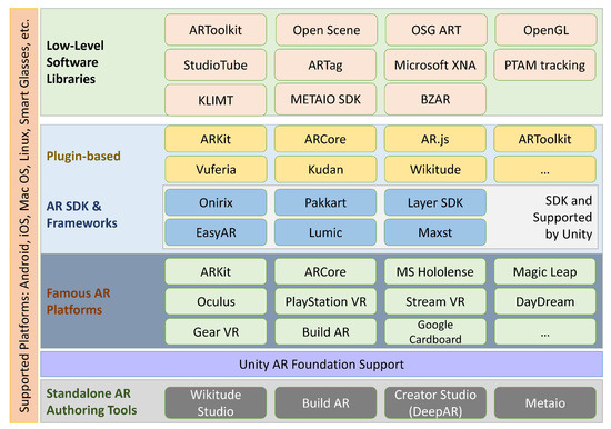 | 7 | Body attached and handheld | Yes | Android iOS | Depicts AR visuals on regular handheld devices | +availability of affordable devices and apps +ubiquitous devices (e.g. smartphones) +ability to work with haptic and audio sensors | -interaction on tangible devices poses difficulty -visibility of handheld devices (e.g., brightness and contract) | Leisure | [177,178,179,180,181,182] |
