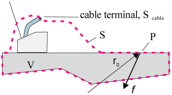 which is Equation (4) of [7] (surface S has no internal flaws; therefore, the part corresponding to in [7] has been omitted in (3). We follow Primakoff [2] in the evaluation of the second integral, which is nonzero only on , where it crosses the electrical cable (Equation (16) in [2]), and obtain