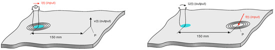 This work can be extended from point excitation/detection on the structure to excitation/detection by a second transducer under study. The 3D SLDV allows measurement of the complete vector field of the surface velocity. The reciprocity proved in this study allows the calculation of the response of the system from such measurement data to point forces of arbitrary orientation acting at any point on the surface. A weighted superposition of these solutions can be performed. This implies that any distribution of surface tractions can be assumed, and the response of the transducer to that distribution can be obtained. There are many interesting examples of such approaches. Let us assume that the surface traction distribution generated by a second transducer in the interface is known. Then, the signal received by the first transducer can be calculated owing to the waves sent by the second transducer. This second transducer could be a thin piezoelectric wafer glued to a plate, which is commonly used in SHM with guided elastic waves. Other examples include lightweight fiber-based SHM transducers [14,15,16], SHM transducers introducing shear tractions on the surface [17,18,19,20], and electromagnetic acoustic transducers [21,22], to name just a few. Laser excitation of ultrasound can also be studied in both thermoelastic and ablation regimes. There is an advantage of such an experiment—simulation over a pure numerical approach: all the characteristics in the wave propagation and coupling between propagation medium and first sensor are exactly contained. The challenges of correct material parameters and coupling conditions are circumvented.