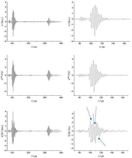 In the transmission experiment, the transducer was excited by a short rectangular voltage pulse U with a duration of 1 µs. Current was calculated using the electrical impedance of the transducer, low pass filtered for noise removal, and displayed in Figure 3.