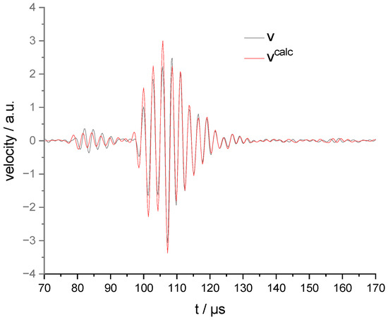 Let us return from the “presumed” (proven not to be a correct) to the “correct” reciprocity expressed by Equation (16). In Figure 5, the normalized signals are plotted together over time. They show an evident agreement in the phase. There are still slight deviations in the arrival time differences of both wave packets, indicating (“slight”) violations of the assumptions for the measurement reciprocity. Properties of the plate such as waviness or surface roughness are excluded as reasons, as the object can be of any shape. Only the absence of external surface tractions is required. For the same reason material inhomogeneities and anisotropies cannot lead to reciprocity violations. Moreover, the coupling of the transducer to the specimen is included in the reciprocal system and can be arbitrary. We assume instead that the system is not identical for the transmitting and the receiving experiment. The measurements were not performed immediately after each other. Therefore, temperature or other environmental conditions could have changed between the measurements, which caused a change in the propagation velocities of the different modes between the measurements. In addition, small position differences between the points for velocity detection and force step excitation could have occurred. The last reason is the most probable: the PLB excitation in the receiving experiment was monitored additionally by the LDV, which was kept at an unchanged position compared to the transmission experiment. So, the PLB´s excitation point was nominally the same as the detection point, but in reality, it was slightly off. The assumption of a travel distance increase of only 2 mm in the reception experiment explains the increased time difference of about 0.4 µs between the S0 and A0 wave packets for .
