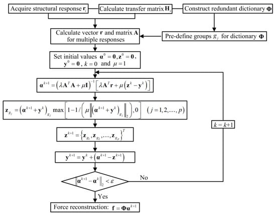 The basic flowchart for the force identification problem is shown in Figure 1. In Figure 1, for the group sparse regularization, represents the elements of vector belonging to the j-th disjoint group . For the standard l1-norm regularization, is specified as , which is the j-th element of the vector, and . is the tolerance error and is equal to 1 × 10−6.