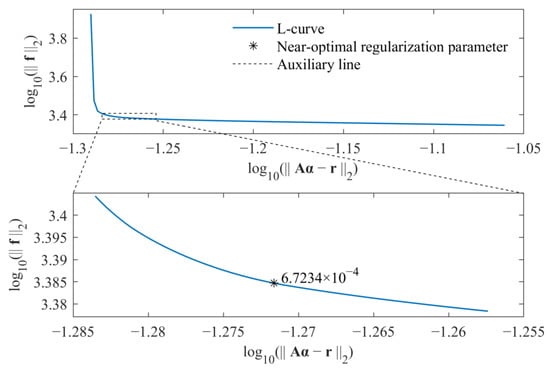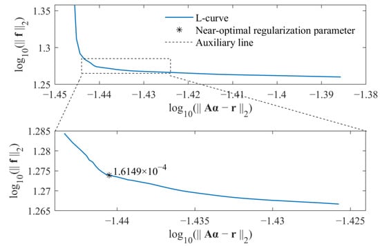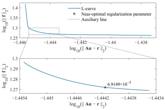 Similarly, the near-optimal regularization parameters for the standard l1-norm regularization and group sparse regularization were selected by the L-curve criterion, as, respectively, shown in Figure 12 and Figure 13. As a result, the weight coefficients were determined, and the identified external force obtained from the proposed method was compared with that obtained from the standard l1-norm regularization, as shown in Figure 14.
