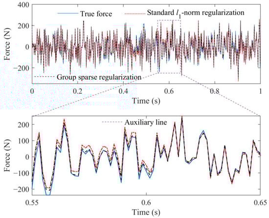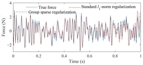 From Figure 5, it can be seen that the external force identified by the proposed method is more accurate by comparing with that identified by the standard l1-norm regularization. The RPEs of the standard l1-norm regularization and group sparse regularization are 18.4109% and 15.7292%, respectively. Because the atom coefficients and have the relationship shown in Equation (15), the local identification accuracy of the time-varying external force can be further improved. These results indicate that the way to define group structures in this study is reasonable, which can improve.