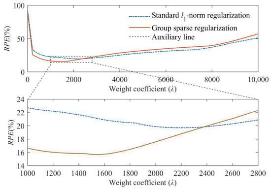 Moreover, the RPEs of identified results obtained from these two regularization techniques with different weight coefficients are shown in Figure 6. From Figure 6, it can be found that more accurate results can be achieved by the group sparse regularization when the optimal weight coefficient is used. Meanwhile, the minimum values of RPE curves are, respectively, approximate to the RPEs of identified results in Figure 5, which indicates that the selection of the weight coefficient with the help of L-curve criterion in this study is reasonable.