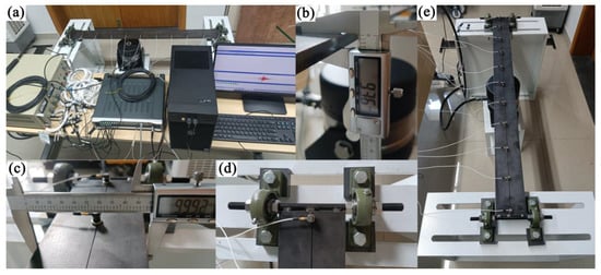 Experiment on beam structure for force identification. (a) Experimental setup. (b) Height of beam structure. (c) Width of beam structure. (d) Support of beam structure. (e) Beam structure.