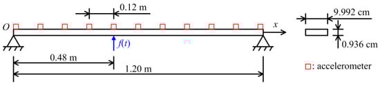To evaluate the effectiveness of the proposed method, a beam with a span of 1.2 m was adopted for force identification in the laboratory, as shown in Figure 7. The two sides of the beam were simply supported, and the corresponding diagram is shown in Figure 8. The width and height of the beam were 9.992 cm and 0.936 cm, respectively. The elastic modulus was 2.0 × 1011 N/m2. Mode testing and signal acquisition were, respectively conducted in this study, so 11 accelerometers were evenly placed on the beam, and the distance of each two adjacent accelerometers was 0.12 m.