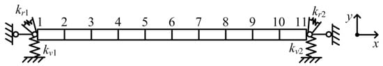 Modal parameters of the first three orders were analyzed, and these parameters were used to calibrate the finite element model (FEM) of the beam. Because the supporting conditions of the beam were not ideal, approximate supports in the FEM were used to simulate the support conditions, as shown in Figure 9. Meanwhile, because two threaded rods were, respectively used to connect the beam structure with the supports, the density of FEM needed to be updated. As a result, the vertical spring coefficients were set as kv1 = 1.0531 × 107 N·m−1 and kv2 = 2.0495 × 107 N·m−1, respectively. Meanwhile, the rotational spring coefficients were set as kr1 = 7.5103 × 101 N·m/rad and kr2 = 6.2786 × 101 N·m/rad, respectively.