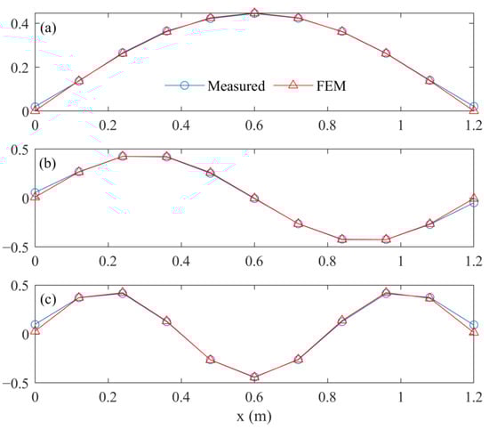 As a result, the first three frequencies calculated based on the updating FEM were equal to the measured values when the approximate values were, respectively, considered as 14.8969 Hz, 58.8586 Hz, and 131.5050 Hz. At the same time, the first three damp ratios obtained from the mode testing results, i.e., 3.7136 × 10−3, 1.8644 × 10−3, and 3.8858 × 10−3, were directly used to calculate the transfer matrix. Moreover, the comparisons on the first three mode shapes are plotted in Figure 11. For intuitive comparison, each modal shape vector is scaled by its 2-norm.