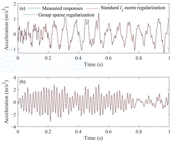 Furthermore, the acceleration responses reconstructed from the identified external force obtained from these two methods can be seen in Figure 15.