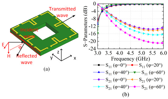 Figure 2a shows the simulation model of the unit cell of the NRMS when the incidence waves impinge on it normally, where the E-field of the incidence waves in the tangential direction of the NRMS and the H-field of the incident waves in the vertical direction of the propagation direction of the incident waves. Wave ports are embedded on the top and bottom surfaces of the unit cell without any air gaps. The simulated S−parameters under TE and TM modes at different incident angles of θ offset the normal direction are provided in Figure 2b. The S11 is less than −2.5 dB for TE mode, while it is lower than −6 dB for TM mode within 60° from 3 to 5 GHz. The extracted permittivity and permeability under TE and TM modes with different θ are given in Figure 2c,d, respectively. Both the extracted permittivity and permeability of the unit cell under TE and TM incidence waves at different angles of θ are positive, which means that the space waves along the normal direction of the NRMS can propagate through the unit cell freely.