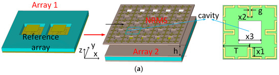 In this section, an example of a dual-element antenna array with a NRMS is given to verify the decoupling performance of the proposed NRMS. The design procedure of the isolation improvement for a dual-element dual-polarized antenna array with NRMS and the configuration of the reference array in the design procedure is given in Figure 4a,b, respectively. This array implements stacked microstrip antenna elements to obtain a broad operating bandwidth. The square metal patch is printed on the top surface of the RO 4350B substrate with a permittivity of 3.66 and a loss tangent of 0.002. The center-to-center distance between the array elements is 16.5 mm (0.5λ at the center frequency). Four orthogonal slots are etched on the bottom square patch to reduce the cross-polarized mutual coupling between two ports of the antenna array element itself. A PP (polypropylene) board with a permittivity of 2.2 is placed above the lower layer substrate to support the upper layer patch antenna. Then two cavities on the corresponding position of the antenna array elements are engraved to provide a space for the PCB board solder. Port1 and Port2 work in x-polarization, while Port3 and Port4 work in y-polarization. Here, the PP board does not have any other impact on the antenna performance besides supporting the two-layer substrates. The reference antenna array shown in Figure 4a is labeled as Array 1. In the next step, Array 2 is shown, where the NRMS is employed above Array 1. Here, the period of T and the size of x1 of the metal ring is 8 mm and 2.75 mm, respectively. The thickness of the substrate is 1.524 mm. The specific geometry and dimensions of the reference array in the design procedure are depicted in Figure 4b, including the overall structure of the reference array from the front side view and the structure of each layer from the top side view.