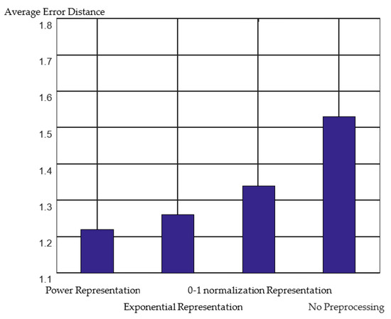 Preprocessing of the WiFi RSSI has a significant influence on positioning accuracy. For the IMUWIFINE dataset [39] used in this study, the positioning situations of zero-one normalization representation, exponential representation, power representation, and no preprocessing were tested. The RSSI value in the dataset ranges from −93 dBm to −34 dBm and the RSSI value of the undetected AP was set to −100 dBm; thus, c was set to −100 in this study. The experimental results are shown in Figure 3. It can be observed that WiFi RSSI preprocessing significantly improves the positioning effect. In addition, the power representation has the best effect, and consequently, a power representation is chosen to conduct the RSSI data preprocessing.