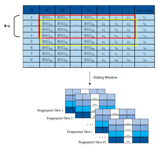In this study, a fingerprint vector sequence is selected as the input of the model. Temporal fingerprint slices are constructed by window sliding, where the size of the sliding window was set as , and the fingerprint vectors in continuous-time to time were set as a group to form a temporal fingerprint slice. Each temporal fingerprint slice contains fingerprint vectors collected continuously. Fingerprint vectors have spatiotemporal dependence and the positioning accuracy can be improved by combining the historical fingerprint information. Considering the size of the window as an example, the construction method of the sliding window is introduced, as shown in Figure 4. A window of size four was maintained, and a step of one is taken to continuously slide down on the temporal fingerprint dataset. The fingerprint vector collected from to constitutes the fingerprint slice and the fingerprint vector collected from – constitutes another fingerprint slice. Fingerprinted slices are constructed successively in this manner.