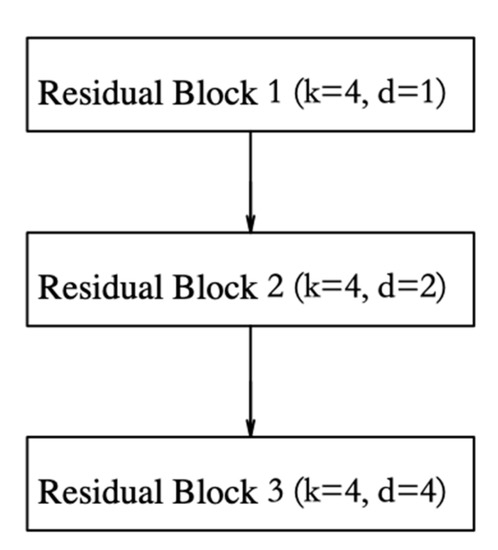 The framework of the TCN feature extractor is shown in Figure 7. where, denotes the dilation coefficient. The dilation coefficient of the three residual blocks increases exponentially, which causes the information receptive field to expand by two times, in turn. Here, represents the size of the convolution kernel used for feature extraction. The frameworks of the three residual blocks are identical, except for the expansion coefficient. The residual connection mechanism prevents network degradation, which effectively solves the problems of gradient disappearance and explosion.