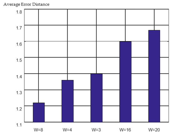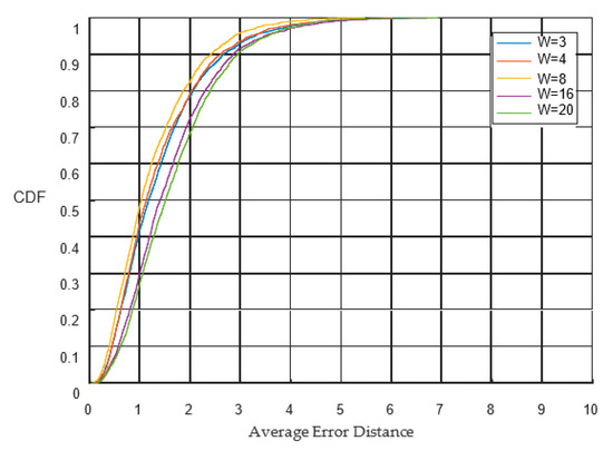 The minimum average error distance was obtained when the time-series length was eight. The cumulative error distribution curves for different time-series lengths are shown in Figure 12. It can be observed from the figure that when W = 8, the error distribution curve rises the fastest, and the curve is the shakiest. More than 80% of the positioning results achieved errors of less than two meters. The details can be found in Table 5.