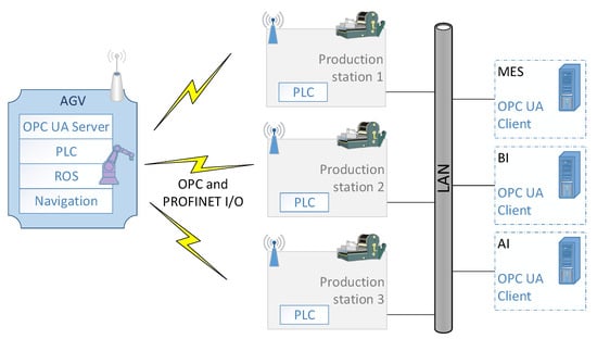 The concept of the communication system is presented in Figure 1. On the left side of the figure, there is a single AGV that has some components installed on it: (a) a programmable logic controller PLC with some I/O modules to control the AGV; (b) an ROS to control the collaborative robot; (c) a navigation system and (d) an OPC UA Server for collecting information about the state of the AGV and the robot. In the middle of the figure, there are three production stations to which the AGV docks.