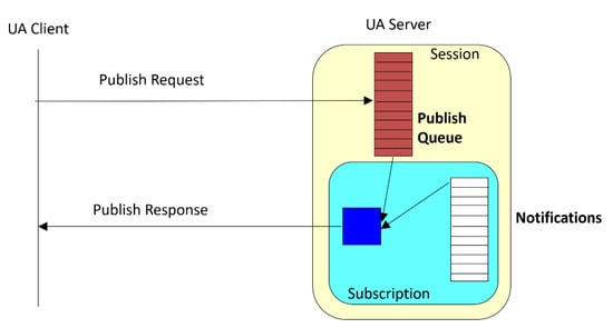 The subscription-based communication services enable the transition from the communication mode query response (request confirmation), which is a typical client-server communication, to the producer-consumer communication model in which the server acts as the data producer in accordance with the parameters that are required in the subscription by a given client []. This model differs from the consumer-provider model that is used, e.g., in the Profinet I/O in that the client must periodically send a Publish Request to which the server responds with a Publish Response as is presented in Figure 2. Such a cyclic request is necessary because the underlying communication protocols that are used by OPC UA do not allow callback communication. The advantage of a subscription is a significant reduction in the volume of information that is exchanged via the network; the disadvantage is that the stateful communication mode is used in which all of the subscription parameters have to be stored on the server [].