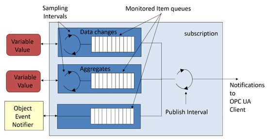 The information content that is sent on a given subscription depends on the requirements that were declared by the Client using the services, which are grouped by the MonitoredItem Service Set. Each variable that is transmitted in a subscription can be sampled at a different frequency. Individual samples are buffered and then sent together with the other variables that were declared for a given subscription as is shown in Figure 3. Cyclic sampling can be used for both the raw process data values as well as for the aggregates, e.g., the average or maximum value for a given period. In the case of events, the queue is also used, but due to the unpredictable nature of an event, its impact on communication traffic cannot be precisely calculated. In our experimental tests, only the first type of transmission—the cyclically read values of the variables with buffering by consistently sized queues were used.