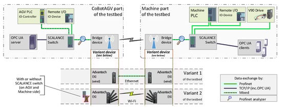Profinet and OPC UA convergence—the two variants of the experimental research testbed: Variant 1: wired communication; Variant 2: wireless communication.