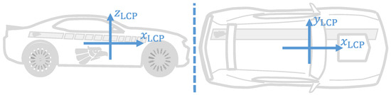 The Local Car Plane (LCP) is the vehicle reference frame and is defined analogue to the ISO 8855:2011 norm [22]. The LCP is composed of the mutually perpendicular , , and axes, with , and origin at the Center of sprung Mass (CoM) of the vehicle. The axis is parallel to the longitudinal axis of the vehicle and points towards the hood, the axis is parallel to the transversal axis of the vehicle and points towards the driver seat, and the axis points upwards. This coordinate system is illustrated in Figure 1.