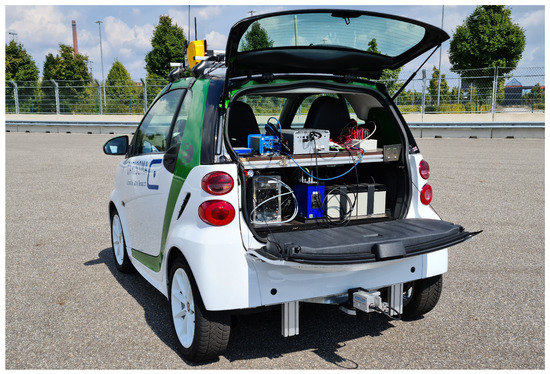 In order to acquire the raw OBD data, a custom cable is built that has an OBD-II plug on one side and a CAN sub-D9 plug on the other end. The cable is connected accordingly to the OBD-II port of the test vehicle and the car PC. Two ROS nodes are then implemented: one that reads the raw OBD data and one that parses them. There are two options to parse the OBD data: (A) by means of the OBD protocol and (B) by means of an open gateway. In the case of the OBD protocol, the J1979 standard [30] specifies the OBD-II PIDs (OBD-II Parameter IDentifications), which allows it to request certain diagnostic information from OBD-II compliant vehicles. The J1979 standard also defines how to parse the OBD data. The open gateway option applies to vehicles that are specially prepared for R&D, as can be prototypes, custom test vehicles, or mock-ups. In these cases, the OBD data can be parsed, for example, with a CAN matrix provided by the manufacturer of the test vehicle. Among others, the OBD measurements can include the velocity as shown by the speedometer, the individual velocity of each tire, and the steering angle. However, for the purpose of this paper, only is considered.