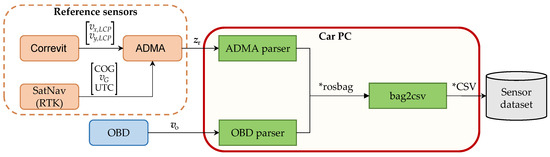 As for the reference sensor data, the Correvit is connected to the ADMA via a CAN cable and the ADMA is connected to the car PC via an Ethernet cable. The ADMA receives position, velocity, and COG correction data from a SatNav receiver, and velocity correction data from the Correvit as well. The ADMA then sends to the car PC the performed inertial measurements, the correction data as received by the external sensors (SatNav and Correvit), and the result of the fusion of the inertial measurements with the correction data. A ROS node that runs on the car PC then reads and parses the ADMA data, as shown in [31]. Once both the OBD and reference data are parsed, they are stored in form of rosbags. The rosbags are finally converted to CSV files according to [32].