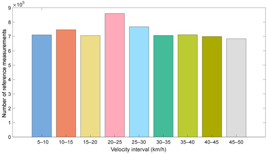 For this, the test vehicle is randomly driven on the closed test track of the University of Applied Sciences of Ingolstadt (Technische Hochschule Ingolstadt), Germany, covering velocities from to . The dataset has a duration of ≈1282 min, which accounts for ≈535 km, reference measurements and OBD measurements. So as foster the diversity of the dataset, the vehicle was driven without aids that help maintain a constant velocity, such as cruise control. In addition, random acceleration and braking instances were included. The reason for the different number of OBD and reference measurements is that the OBD data cannot be obtained in deterministic time intervals. Instead, the arbitration IDs and the CAN implementation determine when the OBD data are published. A histogram of the dataset is shown in Figure 4.