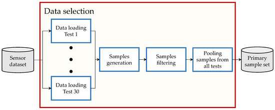 After the sensor dataset is generated, the data processing is performed. The objective of this is to generate an ML- database from the sensor dataset. The ML-database is used later to train and evaluate the TNN (Section 3.4). The process consists of three steps: (1) data selection (Section 3.3.1), (2) data balancing (Section 3.3.2), and (3) data splitting (Section 3.3.3). A graphic depiction of the process is shown in Figure 5 and is detailed in the following subsections.