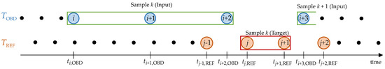 Given that the objective is to use OBD data to infer future velocity measurements as if they were made by the reference sensors, the timestamp associated with the first velocity measurement of the target sequence must be bigger than the timestamp associated to the last element of the input sequence, so that