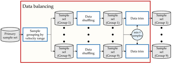 This step aims to generate sample sets from the primary sample set generated in Section 3.3.1. This groups the samples according to predefined velocity ranges and equalize the number of samples of all groups. A graphic depiction of this is shown in Figure 8.