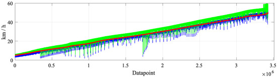 Another proof of the robustness of the method can be inferred from Figure 15. There, the reference velocity , the OBD velocity , and expert velocity are shown. One can notice that , and therefore , present high noise levels. This can be explained by how the dataset is generated. As mentioned in Section 3.2, the test vehicle was driven randomly on the test track, including random and harsh acceleration and braking. This way of driving that fosters the variability of the dataset also causes larger differences between the reference and OBD velocity. However, the proposed method is able to learn the error patterns from the data and is still able to generate highly accurate velocity correction data from faulty OBD data.