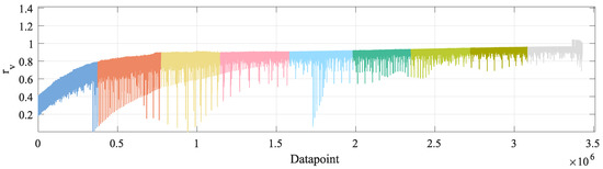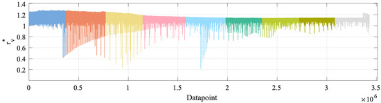- Temporal consistence. As stated above, the OBD data cannot be obtained in deterministic time intervals. This implies atypical time lapses between consecutive measurements. In order to detect these atypical time lapses, each time lapse between all consecutive OBD measurements contained in is calculated. This results in values. A mean and a standard deviation are computed from all values. Each is compared to and . If , the sample where belongs is kept and filtered out otherwise. The target sequence is filtered by analogy.