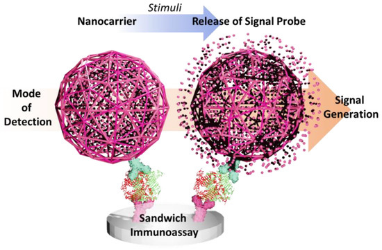 Illustration of a nanosphere-loading signal probe for signal amplification through the formation of the immune sandwich complex and stimuli-mediated cargo release.
