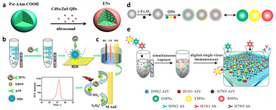 Besides preserving the electroluminescence activity of the QDs, the poly(styrene/acrylamide) copolymer nanospheres could also maintain the QDs’ fluorescent activity [38]. Inspired by this concept, virus detection using fluorescent magnetic nanospheres was developed, as shown in Figure 3d–e. In this detection strategy, poly(styrene/acrylamide) a copolymer nanosphere was used as a basic template for layer-by-layer assembly, followed by functionalizing metal elements on γ-Fe2O3. To afford a multiplex virus detection platform, different emission wavelengths of QDs were gradually assembled onto the modified nanospheres, resulting in green, yellow, and red fluorescent magnetic nanospheres. These various fluorescent magnetic nanospheres were subjected to anti-H9N2, anti-H1N1, and anti-H7N9 antibody conjugation for rendering multiple virus detection. From the evaluation of fluorescence activity, the nanospheres exhibited strong and stable fluorescence intensity from each green, yellow, and red fluorophore with little overlap. This result highlighted the capability of nanospheres to maintain the activity, improve the fluorescent stability, and protect it from dye photobleaching.