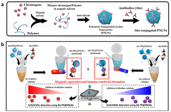 In one of our studies, we exploited poly(D,L-lactide-co-glycolide) (PLGA) for constructing a self-assembled chromogenic polymeric nanosphere for a colorimetric biosensing platform, as illustrated in Figure 5 [44]. This research used a pH-sensitive indicator of phenolphthalein (PP) and thymolphthalein (TP) as sensing chromogen instead of relying on an enzyme−substrate mechanism that suffers from vulnerability. The PLGA nanosphere encapsulated PP and TP by nanoprecipitation to establish a biosensing platform, thereby enriching the detection signal. The antibody specific to the influenza virus was conjugated with the polymer nanosphere, and magnetic nanoparticles (MNPs) were coupled for endowing magnetic separation feature on the fabricated immunosensor. Once the immune sandwich formation of the influenza virus, antibody nanosphere, and MNPs were formed, the following alkaline treatment of the corresponding nanosphere lysed the polymeric boundary. As a result, the chromogen released from the nanosphere cargo and the encounter of hydroxide ions with chromogen generated an enhanced colorimetric signal. The sensing performance of this PP- and TP-containing nanosphere to detect influenza virus was evaluated by detecting the absorbance at 560 nm and 595 nm, respectively. The sensitive and selective detection result was obtained with satisfactory linearity from 101 to 106 fg/mL, and the limit of detection (LOD) was 27.56 fg/mL.
