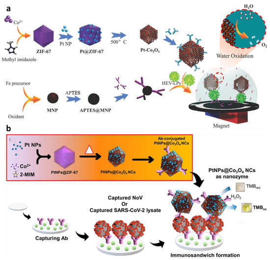 In our laboratory, a PtNP-incorporated ZIF-67 nanostructure was developed to construct a hepatitis E virus (HEV) sensor using the chronoamperometry water oxidation principle (Figure 9a) [85]. As a catalyst for efficient water splitting, PtNPs were entrapped within the hollow nanostructure of ZIF-67. The ZIF-67 was functionalized with an antibody to be able to make a sandwich immunocomplex, with the magnetic NPs having a capture antibody. The number of captured HEV-like particles (HEV-LPs) on the concentrator of magnetic NPs is proportional to the resulting current from the oxidized water molecules by PtNPs. This approach obtained low LOD (0.81 fg/mL) with acceptable linearity (R2 of 0.991), highlighting the benefit of electrocatalytic water oxidation reaction use in the ZIF-67 matrix for attaining ultrasensitive detection. This ZIF-67 platform was revisited and repurposed by loading chromogen (TMB) for a colorimetric-based immunoassay platform of SARS-CoV-2 detection (Figure 9b) [86]. This hybrid nanozyme synergistically works by boosting catalytic activity, enabling a subfemtogram level of detection.
