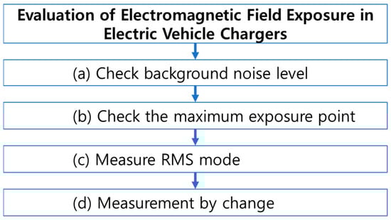 The electromagnetic field exposure from EV charging facilities is evaluated as shown in Figure 1. The measurement sequence and conditions were designated in the order of (a) to (d) and Table 3, respectively. First, the background noise level was checked. This means the measured electromagnetic field value is in an uncharged state. This measurement step is aimed at obtaining accuracy and reliability when measuring in a state of charge. The body of the EV charger, cable, and handle were measured. Second, the location of maximum exposure to electromagnetic fields in the charging situation was determined. This is a step to determine the trend for precise measurement at the location of maximum exposure to the electromagnetic field. Therefore, the entire body of the charger, cable, and handle are measured in the actual mode. Third, measurements are made in the RMS mode for maximum exposure points of the identified electric and magnetic fields. The second and third steps limit the range to measurements ranging from 20% to 80% of the SoC. This is because of the onboard battery charger, designed to prevent EV battery overload. It switches to the constant voltage mode when the SoC exceeds 80% during charging. Because the charging voltage is constant and the charging current gradually decreases, irregular values may be measured when measuring the electromagnetic field. Therefore, it was precisely measured in RMS mode between 20% and 80% of SoC. Finally, the change in exposure level was confirmed as the SoC changed from 0% to 100% during charging. In the RMS precision measurement step, a single position where high electric and magnetic fields are measured was selected. This is the case with a body, cable, and handle.