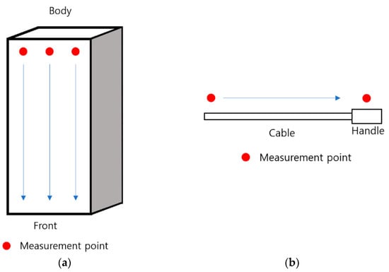 As shown in Figure 2, the measurement location was divided into the main body, cable, and handle. When measuring the charge, the main body’s front, back, and side surfaces were measured, and the front and back sides were measured by dividing the horizontal axis into three equal parts and moving the probe from top to bottom. As shown in Figure 3, the distance between the charger and the probe was measured at 5 cm for the body and 3 cm for the cable and handle. Other cables and handles were measured at a distance of approximately 3 cm.