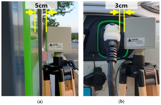 Domestic EV chargers can be broadly divided into fast and standard chargers. This is elaborated in Table 2 by dividing them into installation type, charging method, rated output, and charging standard. The standard charger can be divided into a stand-type installed on the floor, a wall-mounted type attached to the wall, and a mobile type that charges by plugging into a 220 V outlet. In the case of fast chargers, they are classified into the charging ports. The charging ports of domestic vehicles can be divided into an integrated type comprising a fast and a standard charging port and a separate type with a different location. The integrated type can either be the direct current (DC) combo type or the three-phase alternating current (AC) type, whereas the CHAdeMO type is employed as a separate type. They are all in accordance with the IEC-62196-2 standard [23]. Other chargers have a non-charging port that is independent of the charging standard indicated in Table 2 (charging port). In this study, six chargers were selected as measurement targets. These are described separately by their rated capacities and installation type. The standard chargers with a rated capacity of 7 kW are stand-type A, stand-type B, and wall-mounted chargers. The 3 kW rated capacity is the standard mobile. In the DC combo method, there is a fast stand-type C with a rated capacity of 50 kW and a short stand-type D with a rated power of 120 kW. In addition, among the six types of EV chargers, standard stand-type A, standard wall-mounted, standard mobile, and fast stand-type C measured the electromagnetic field while charging EV A with a battery capacity of 64 kW. In the standard stand-type B and the fast stand-type D, the electromagnetic field was measured while charging EV B with a battery capacity of 75 kW.