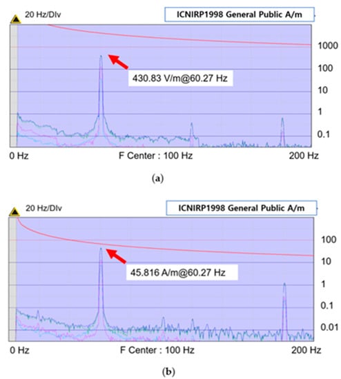 The EI is the value obtained by dividing the electric or magnetic field measurement value “Meas” by the electric or magnetic field reference value “Ref,” multiplied by 100. According to Table 1, the reference value needs to be separately calculated based on the frequency range. In this study, the worst-case electromagnetic field exposure situation is considered. The EI is calculated in the frequency band, where the highest electromagnetic field is measured. In addition to the measurement results in Figure 4, the electric and magnetic field maxima at 60 Hz were predominantly measured in all the measurement results. Therefore, the EI was calculated for a single frequency of 60 Hz. The electric and magnetic field reference values for 60 Hz are 4166.67 and 66.66 A/m, respectively.