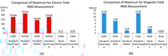The graphs of the maximum values of electric and magnetic field RMS measurements for the six types of chargers are shown in Figure 5a,b, respectively. The maximum electric field was mostly measured in cables and handles. The maximum magnetic field was primarily measured in the body and cable. In addition, the electromagnetic field measurement of the fast charger was significantly lower than that of the standard charger.