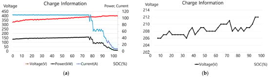 In the measurement at the change in the SoC, each case of a fast charger and a standard charger was compared. In the case of high electric and magnetic fields in RMS precision measurement, the main body of the fast stand-type C and the standard stand-type B cable were compared. The charging information by the change in the SoC of the two chargers is shown in Figure 6a,b. For fast stand-type C, the SoC (%), voltage, current, and power from the charger can be checked. In the case of the standard stand-type B, the power, current, and voltage can be checked in the vehicle; the power and current are displayed constantly and only the change in voltage is observed.