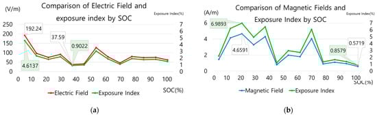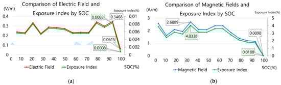 Electromagnetic field characteristics of standard stand B cable SoC change: (a) comparison of electric field measurement and exposure index; (b) magnetic field measurement and exposure index comparison.