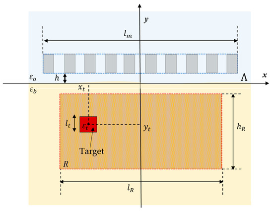 The shallow subsurface scenario in which detection is performed is shown in Figure 1. A multistatic and multiview system with waveguide antennas positioned at height from air–soil interface on a measurement line of length parallel to -axis is used to illuminate the soil. The air is modelled as vacuum (i.e., F/m) and the soil is characterized by a complex dielectric permittivity .