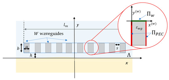 In more detail, the analyzed measurement system, shown in Figure 2, is composed of a set of open waveguides of width and length , filled with material of complex dielectric permittivity . The waveguides are terminated by PEC boundaries on the lateral sides, , and a waveguide port on the top side, In each antenna, a reference system is defined at the waveguide port centered at