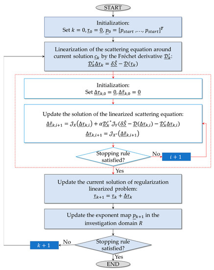 with norm in the space , by moving along a nonstandard gradient direction in the dual space of . In detail, the method consists of two nested iteration cycles as summarized in the flow chart in Figure 4 [54]. At first, at each -th iteration of the external cycle, Equation (9) is linearized around its current solution (denoted as ) with null initial value . Then, a Landweber-like approach in Lebesgue space is adopted to solve the resulting linearized problem (as shown in the red box of the flowchart). With reference to Figure 4, , , and represent the duality maps of , and , respectively. ( is the dual space of , with as the Hölder conjugate of ), is the Fréchet derivative of , and is the step width [52,54].